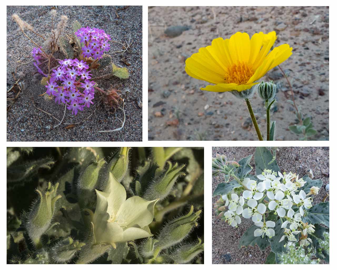 அமெரிக்காவிலேயே உள்ள காய்ந்த, மிக சூடான பகுதியில் மலர்களை பார்க்க முடியுமென்றே யோசிக்க முடியாது, அதிலும் மிக அழகான மலர்களை கொத்து கொத்தாக பார்ப்போம் என்றே நாங்கள் நினைக்கவில்லை. 1000 வகை செடிகள் டெத் வேலி தேசிய பூங்காவில் உள்ளன, அதிலும் 23 வகைகளை டெத் வேலியில் மட்டுமே பார்க்க முடியும். நீரே இல்லாத இந்த டெத் வேலியில் திடீரென்று கொஞ்சம் மழை வந்தால் டெஸெர்ட் கோல்ட் (Desert gold), மணல் வெர்பனா (Sand verbena) போன்ற மலர்கள் தரை முழுவதும் பூத்துக் குலுங்கும். நாங்கள் செல்லும்போது சூப்பர் ப்ளூம் இல்லையென்றாலும் நிறைய மலர்களை பார்த்தோம். பாலைவனம் என்றாலே விதவிதமான கற்றாழை செடிகளை மட்டும் பார்க்கலாம் என்று நினைத்திருந்தோம், ஆனால் பல விதமான செடிகளையும் மலர்களையும் பார்க்க முடியும் என்று இங்கு தான் தெரிந்து கொண்டோம்.